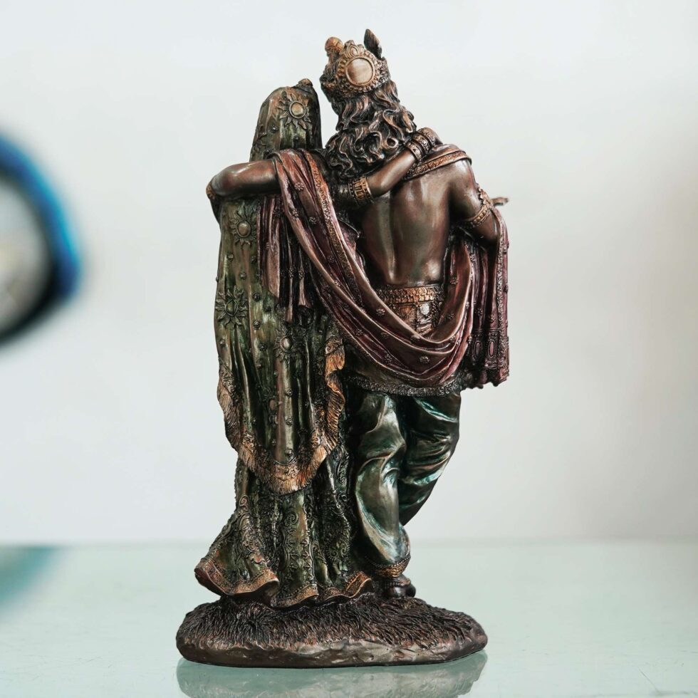 A beautiful and intricate bronze statue depicting Radha and Krishna, two central deities in Hinduism.