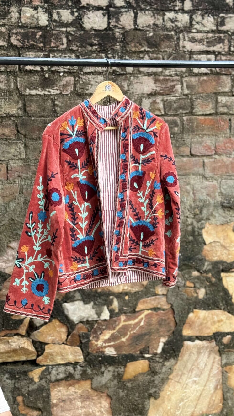 Womens Terracotta Velvet Embroidered Jacket with Floral Design